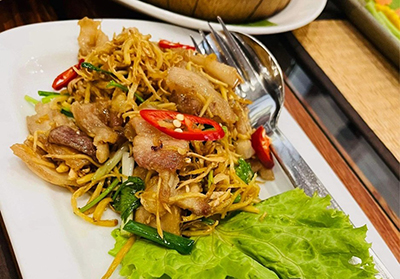 鶏肉をたっぷりの生姜とともに炒めた、カンボジアの家庭で親しまれてきた定番料理。さっぱりとした味わいで食べやすく、暑い気候でも元気が出る一品です。